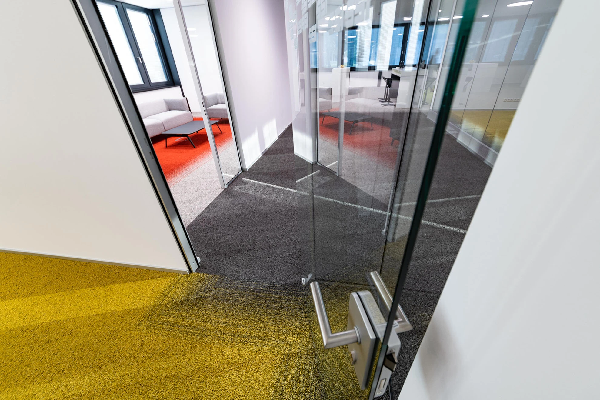 Fotografische Dokumentation des Innenausbaus bei SSI Schäfer in Giebelstadt. Die klaren und augeräumten Fotografien zeigen die Arbeiten und Produkte der Firmen Flokk, Lichtagentur, Tarkett, Wini und Floor Concept.